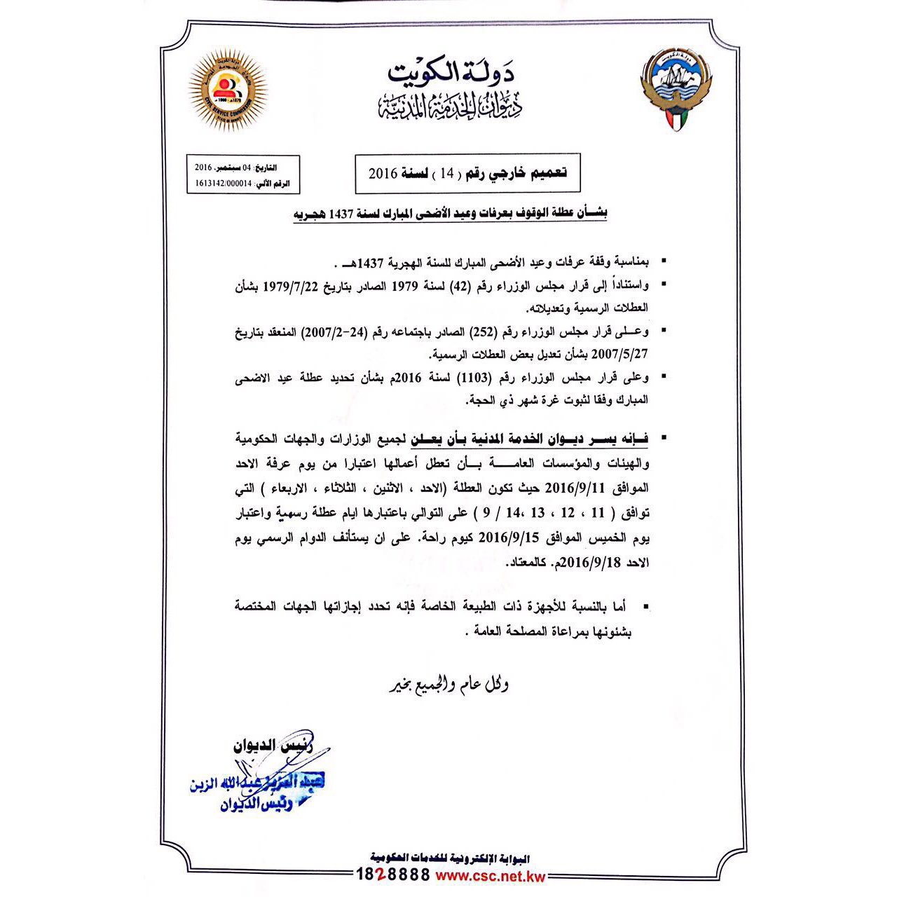 ديوان الخدمة المدنية على تويتر تعميم خارجي رقم ١٤لسنة ٢٠١٦ بشأن عطلة الوقوف بعرفات وعيد الأضحى المبارك لسنة ١٤٣٧هـ من الأحد٩ ١١ والدوام الرسمي ٩ ١٨