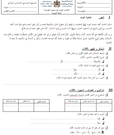 امتحانات إقليمية في اللغة العربية للمستوى السادس ابتدائي مع التصحيح