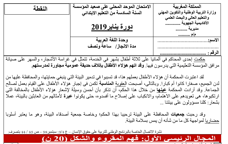 نموذج امتحان الموحد المحلي على صعيد المؤسسة للمستوى السادس ابتدائي اللغة العربية يناير 2019
