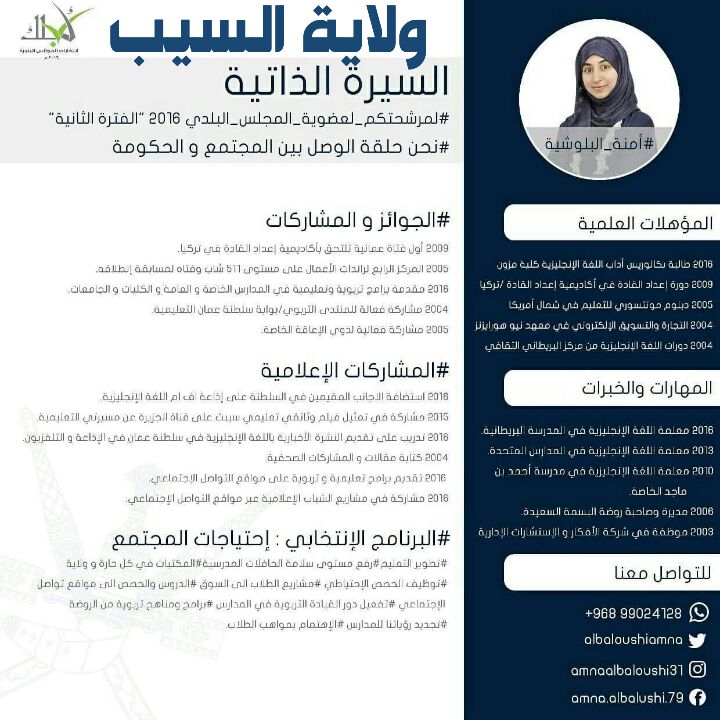 عادل الزدجالي Az ع مان בטוויטר أمنه البلوشية مترشحة لعضوية المجلس البلدي عن ولاية السيب فكر وكفاءة ورؤية ـ تستحق الدعم Albaloushiamna